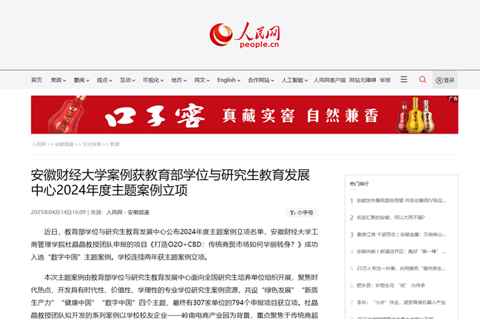 4月14日,人民网、凤凰网以《新利18官方彩票案例获教育部学位与研究生教育发展中心2024年度主题案例立项》为题,报道我校工商管理学院杜晶晶教授团队申报的项目《打造O2O+CBD:传统商贸市场如何华丽转身?》成功入选“数字中国”主题案例。我校已连续两年获主题案例立项。