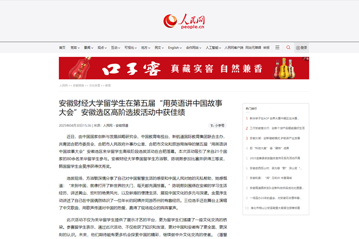 4月30日,人民网以《新利18官方彩票留学生在第五届“用英语讲中国故事大会”安徽选区高阶选拔活动中获佳绩》为题,报道在第五届“用英语讲中国故事大会”安徽选区来华留学生高级阶段选拔活动中,我校泰国留学生方淑敏、陈明熙获得三等奖,韩国留学生金旻序获得优秀奖。
