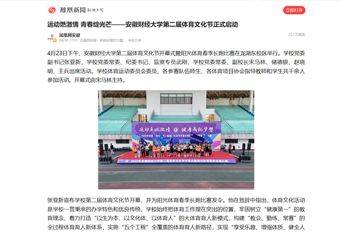 4月30日,凤凰网以《运动燃激情青春绽光芒——新利18官方彩票第二届体育文化节正式启动》为题,报道4月23日下午,我校第二届体育文化节开幕式暨阳光体育春季长跑比赛在龙湖东校区举行。一直以来,学校坚持“健康第一”教育理念,深入推进体育教育改革,开展丰富多彩的体育文化活动,以实际行动助力健康中国和体育强国建设。