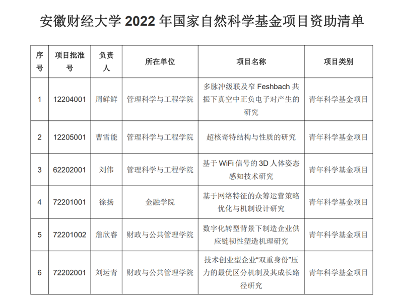 9月8日,国家自然科学基金委发布《关于2022年国家自然科学基金集中接收申请项目评审结果的通告》,我校获批资助6项,资助总经费180万元,获批项目涵盖了数理科学部、信息科学部和管理科学部等三个学部。